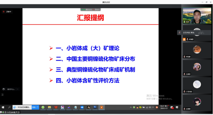 2022年1月5日19:30,公司“齐心抗‘疫’不停研”第七场报告暨“资源论坛”第一百六十讲线上报告顺利举行。此次特邀焦建刚教授作题为“小岩体成(大)矿理论与铜镍矿找矿勘查应用”和肖良副教授作题为“植物化石的古地理和古CO2指示意义”的学术报告。公司师生共计190人参加本次线上学术报告。报告由副经理李佐臣教授主持。
