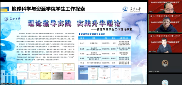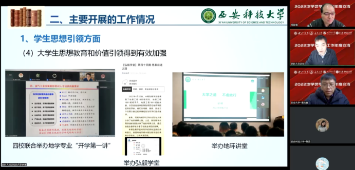 12月29日,西北大学、ylzzcom永利总站线路检测、西安科技大学、西安石油大学四校联合举办2022地学类员工工作年度交流论坛顺利在线上举行。公司党委副书记武永江教授和学工办全体专兼职辅导员参加了论坛。论坛由西北大学地质系党委副书记李政伦主持。