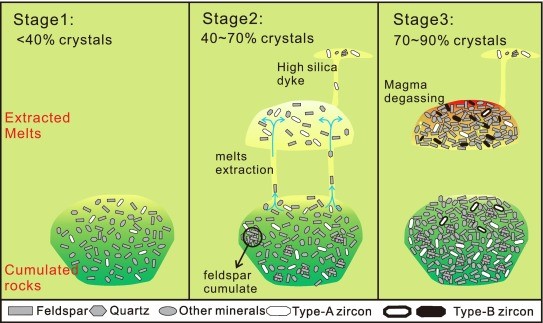 A型花岗岩的成因一直是岩石学家关注的重要科学问题。锆石的微量元素具有示踪岩浆演化过程的重要潜力,其原因之一是锆石可以在岩浆演化的各个阶段结晶。针对上述问题,本研究表明A型花岗岩和其堆晶岩(石英二长岩)中的低U锆石是从同一岩浆储库结晶,而A型花岗岩中的高U锆石是从抽离岩浆储库的高硅熔体结晶而来,堆晶岩中的高U锆石是从被困在岩浆储库内的残余熔体结晶而来。本研究提出了一种全新的A型花岗岩成因模型,认为A型花岗岩是由浅部地壳岩浆储库内晶体-熔体分离过程所形成。